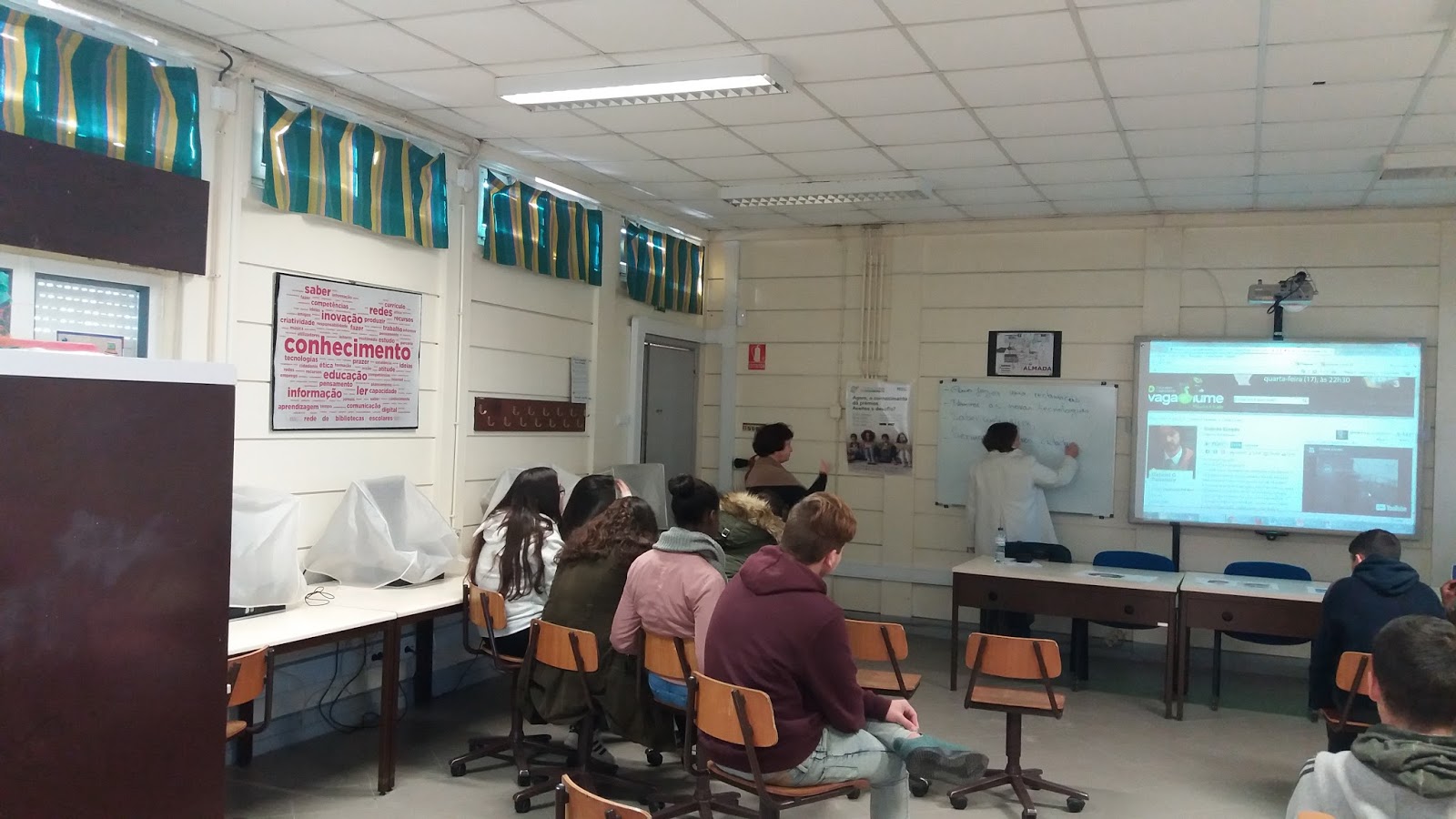 Alguns alunos participaram na decoração da BE, com trabalhos realizados nas aulas de Educação Visual. Os alunos do 6º B participaram na leitura de poemas alusivos à Primavera e os do 9ºB partilharam leituras alusivas ao “Dia da Floresta”. No final, os alunos decoraram o espaço exterior, com andorinhas e cata ventos.